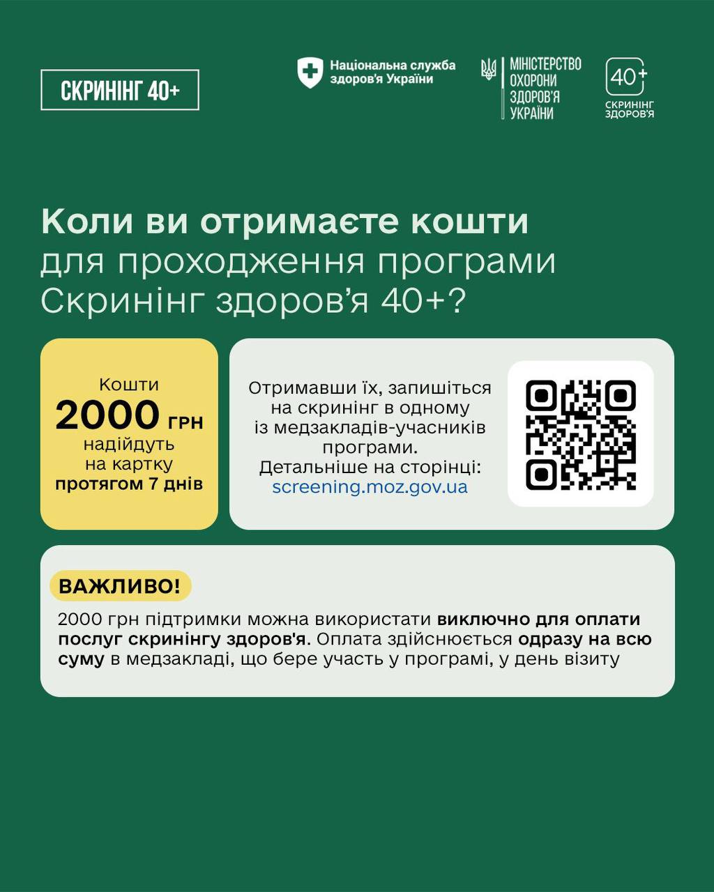 - За 7 днів на картку надійдуть кошти — 2000 гривень. Їх можна використати тільки для проходження Скринінгу здоров’я 40+ у визначеному переліку закладів.