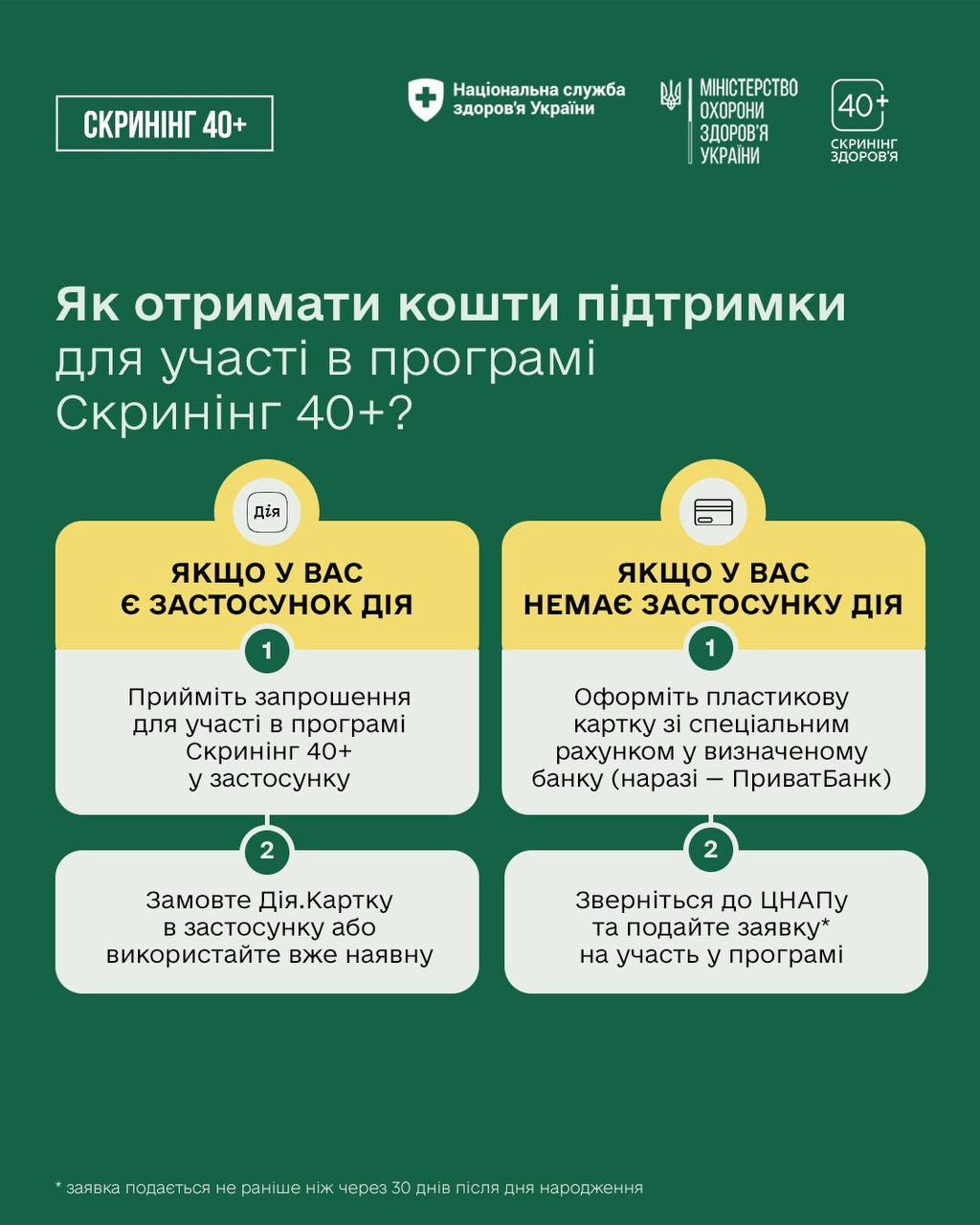 - Запрошення на скринінг надходить в застосунок Дія на 30-й день після дня народження (якщо людині виповнилося 40 років або більше).